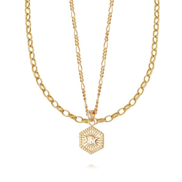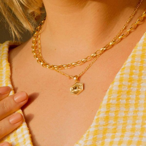 The key to the perfect layering look is having a solid base layer, or what we like to call, a chunky chain. We’ve paired this everyday, wear-it-all-the time necklace with an intricately carved pendant. Crafted from 18ct gold plated sterling silver this layering pair will add the ultimate amount of glow to any look.